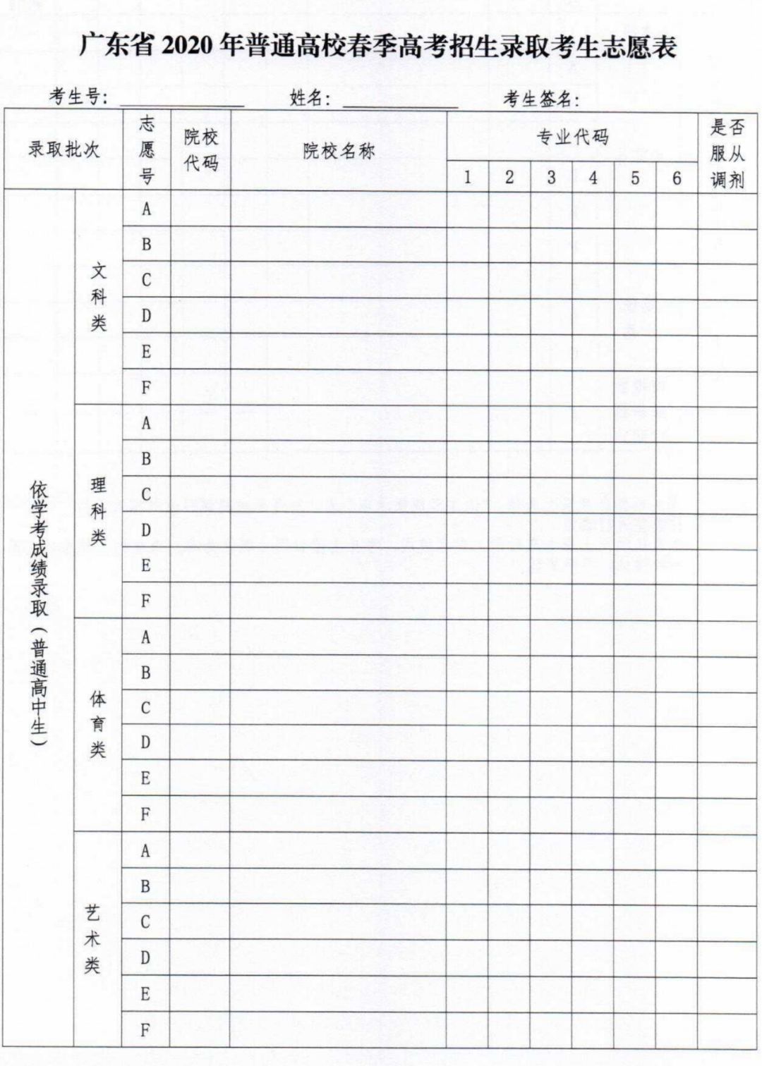 附件: 广东省2020年普通高校春季高考招生录取考生志愿表(样式)