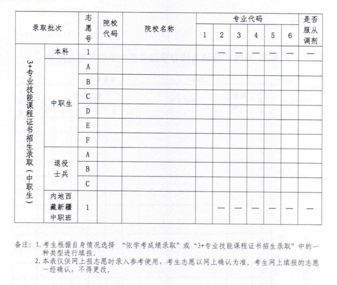 本科批次志愿填报设1个院校志愿,每所院校可填报1个专业志愿,不设是否服从专业调剂选项。专科批次中对中职生设一个平行志愿组6个院校志愿,每所院校最多可填报6个专业志愿、1个是否服从专业调剂选项;专科批次中对退役士兵设一个平行志愿组3个院校志愿,每所院校最多可填报6个专业志愿、1个是否服从专业调剂选项;专科批次中对内地西藏新疆中职班应届毕业生(含青海藏区生源,下同)设1个院校志愿,每所院校可填报1个专业志愿,不设是否服从专业调剂选项。