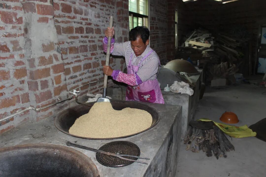 ▲黄准多在嶂下村蒲米制作工厂进行蒲谷。