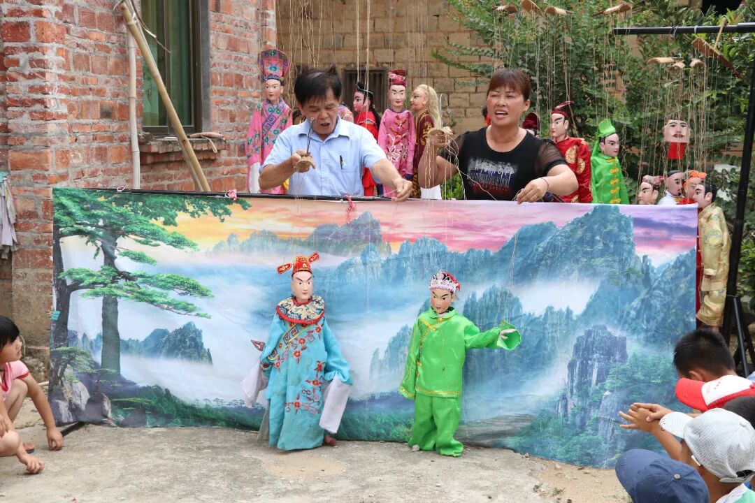 ▲图左为钟荫光在紫金农村演出提线木偶戏《梁四珍与赵玉粦》。