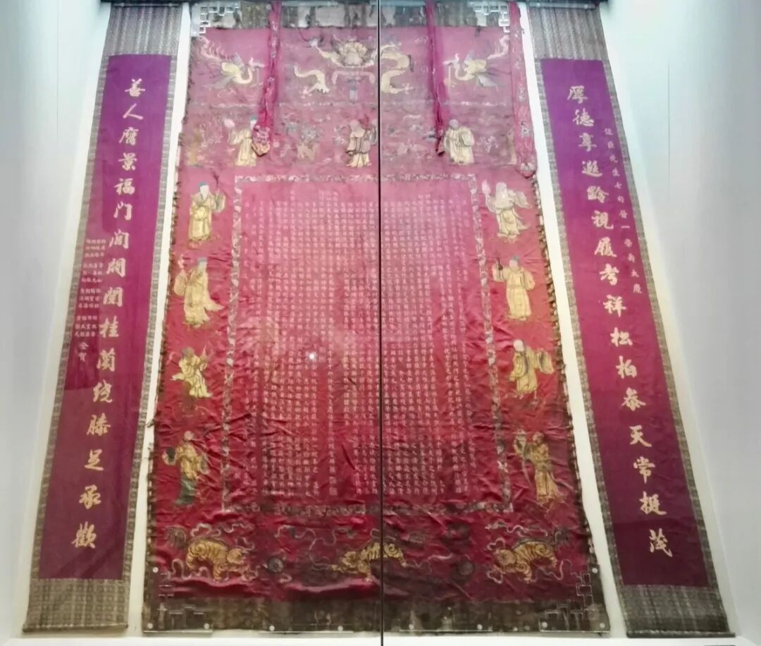 它是清道光三十年钟姓老妇儿孙为其八十一岁祝寿所精心制作的,为长方形红色丝绸刺绣,通宽190、通高367、厚0.2厘米,四周绣有龙凤吉祥物、八仙人物图案,中间绣有繁楷体祝寿文,彰显了客家人尊老敬孝的文化传统。