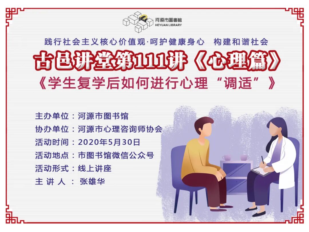 随着全国疫情防控工作日渐向好,我们也回到了阔别已久的校园,“宅”家近三个月的部分同学难免会有一些心理压力或焦虑情绪,为此,河源图书馆邀请了河源市心理咨询师协会张老师一起走进心理课堂,去学习在复课之后如何对自我进行积极的心理调适。