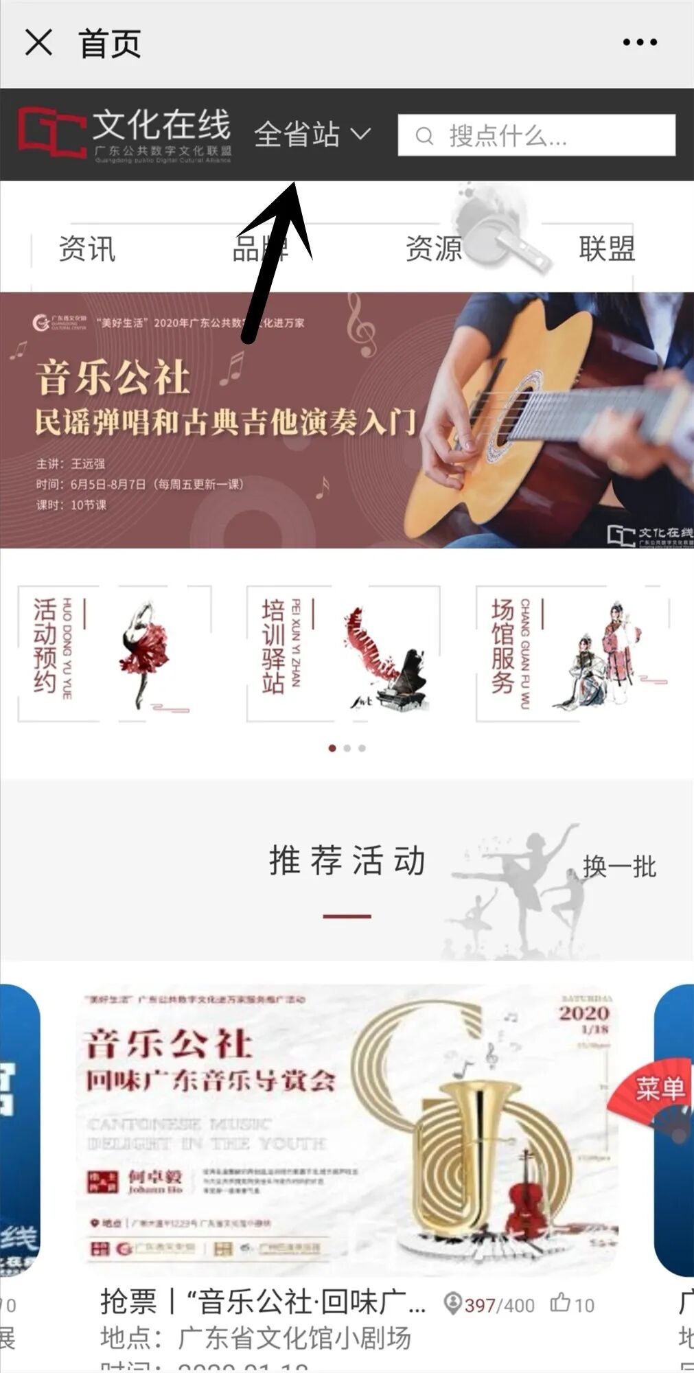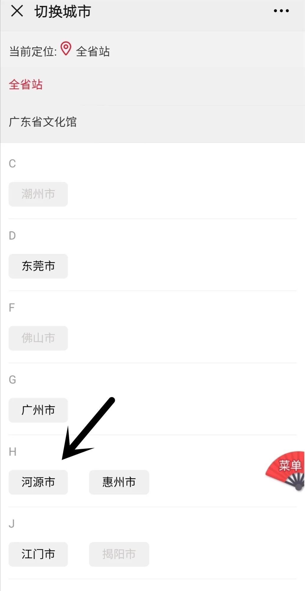 3、点击页面上方全省站切换成河源市,再点击左上方河源市文化馆