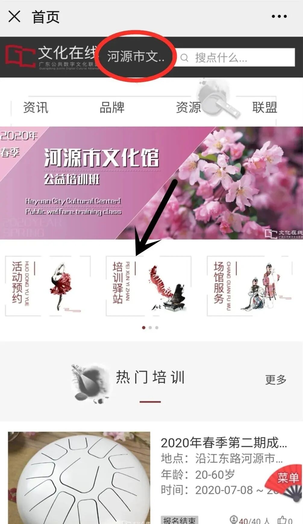 4、切换河源市文化馆后回到首页,点击培训驿站