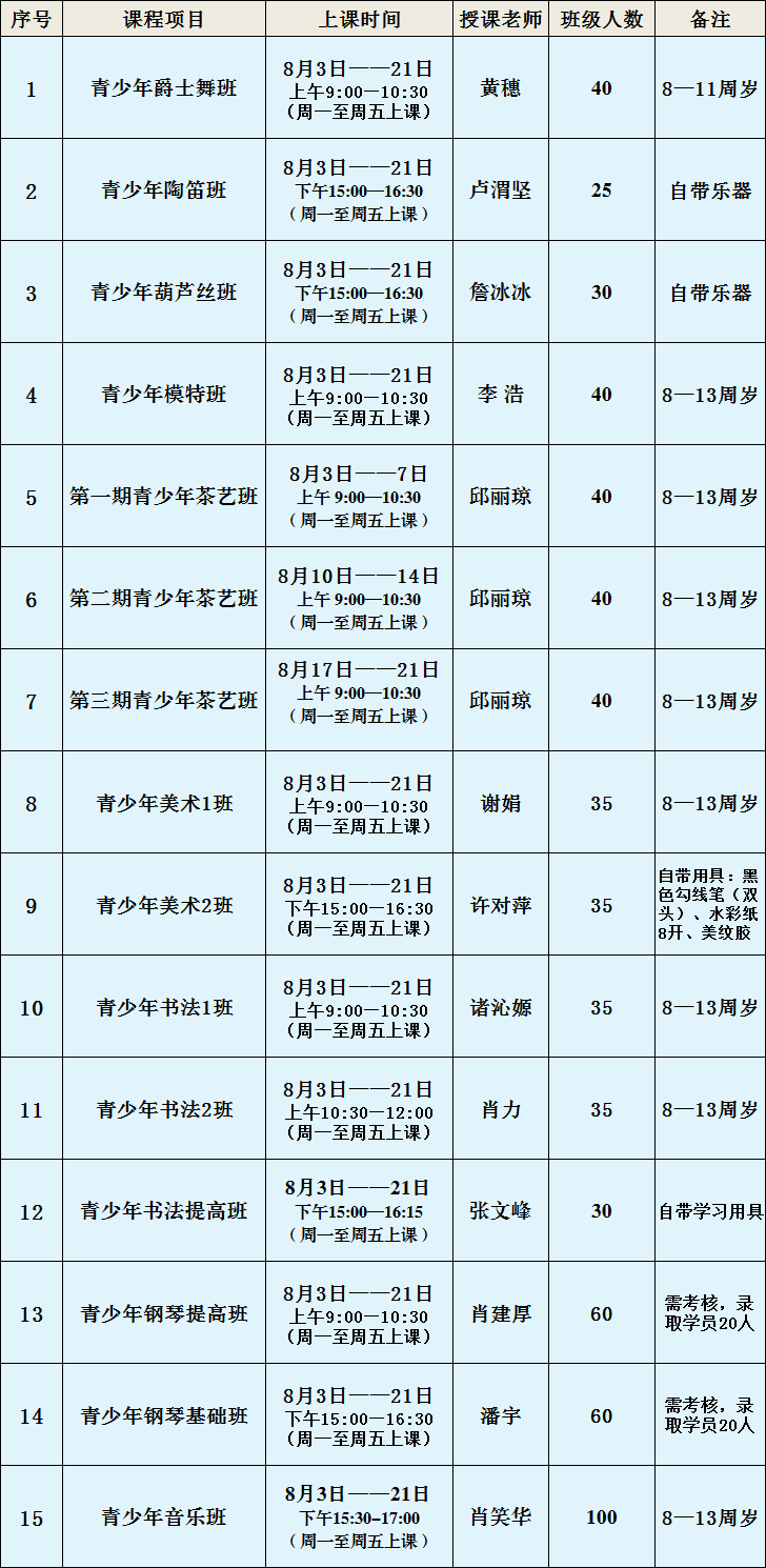 为深入贯彻落实党的十九大精神、习近平总书记对广东重要讲话和重要指示批示精神,积极培育和践行社会主义核心价值观,大力实施文化惠民工程,提升广大青少年的文化艺术素养,培养未成年人良好的兴趣爱好,河源市文化馆开展2020年青少年暑期公益培训班。