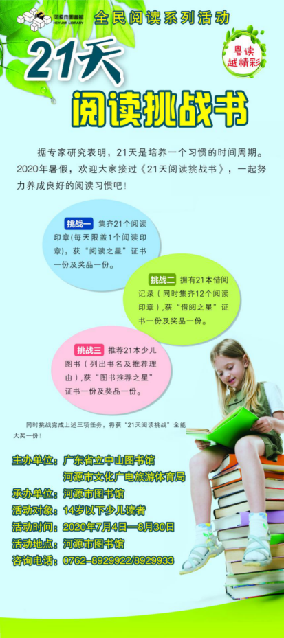 根据广东省文化和旅游厅《关于开展2020年“粤读越精彩”全民阅读系列活动的通知》,2020年暑假,我馆在暑期开展青少年阅读推广系列活动之“21天阅读挑战书——少儿阅读习惯养成活动”。