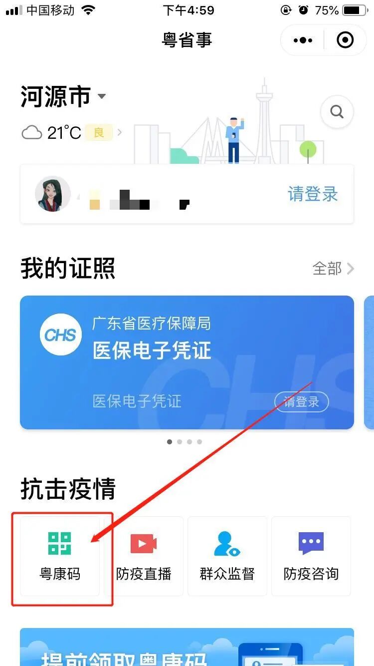 ①微信小程序搜索“粤省事”或识别下方二维码,找到【粤康码】获取入口