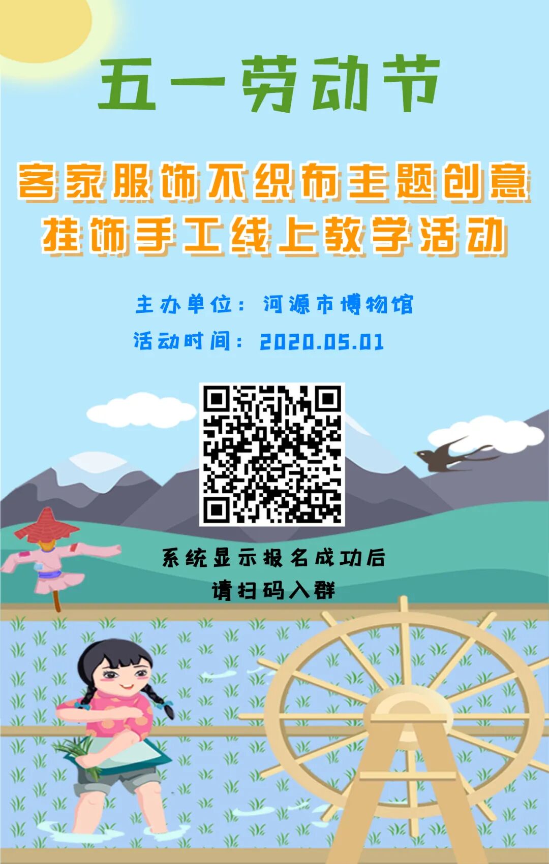 扫码关注“河源市博物馆”微信官方公众号—点击左下方栏目【展览服务】—【活动预约】—查看【“五一”劳动节客家服饰不织布创意手工线上教学活动】—【活动报名】—填写报名信息(如需取消报名,请拨打电话3618008告知工作人员)