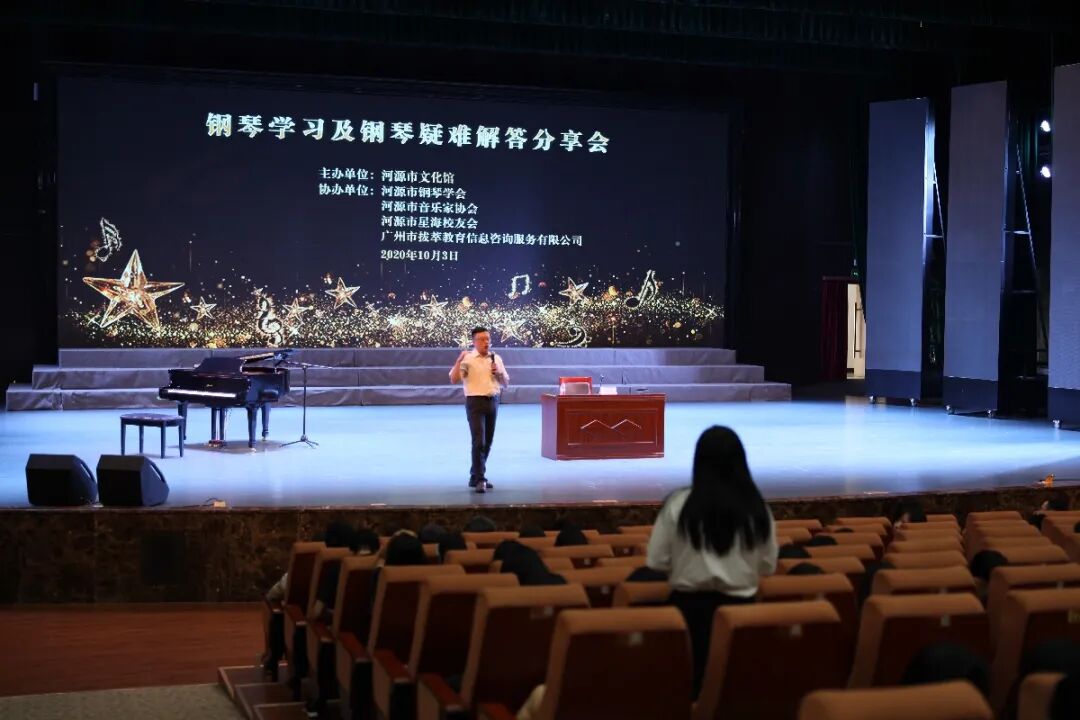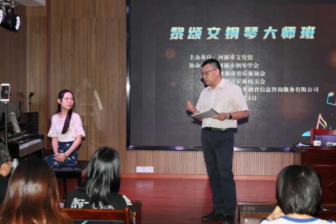 10月3至4日,由河源市文化馆主办,河源市钢琴学会、河源市音乐家协会、河源市星海校友会、广州市拔萃教育信息咨询服务有限公司协办的钢琴学习及钢琴疑难解答分享会在河源市文化馆举行。活动邀请了著名钢琴家、美国钢琴表演音乐艺术博士、中国音乐家协会钢琴学会副会长、广州星海音乐学院钢琴系主任黎颂文教授莅临河源教学,吸引了我市专业钢琴教师和钢琴爱好者近300人到场聆听。