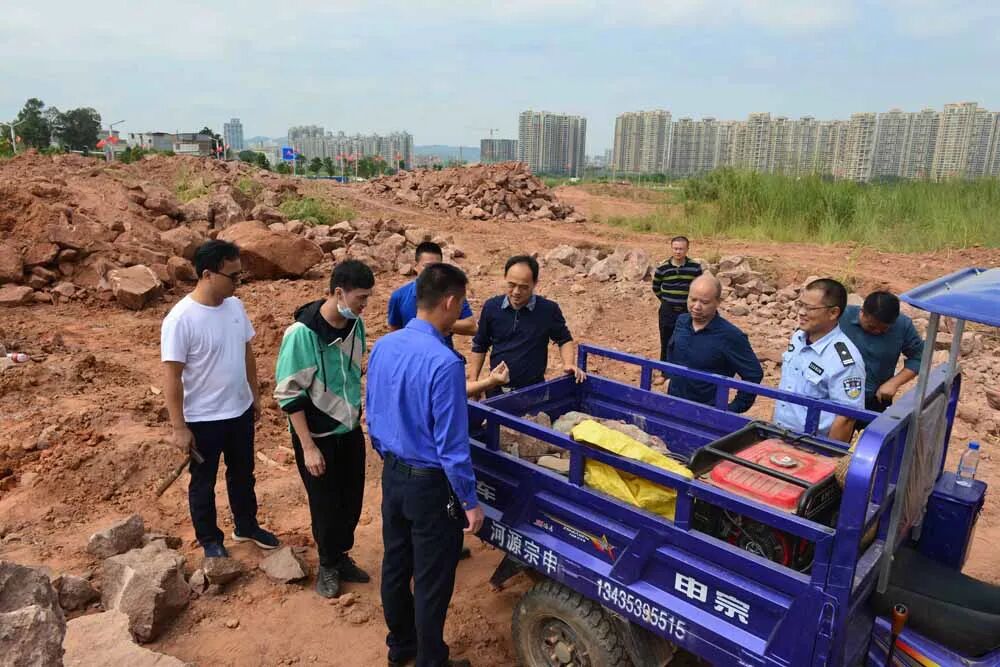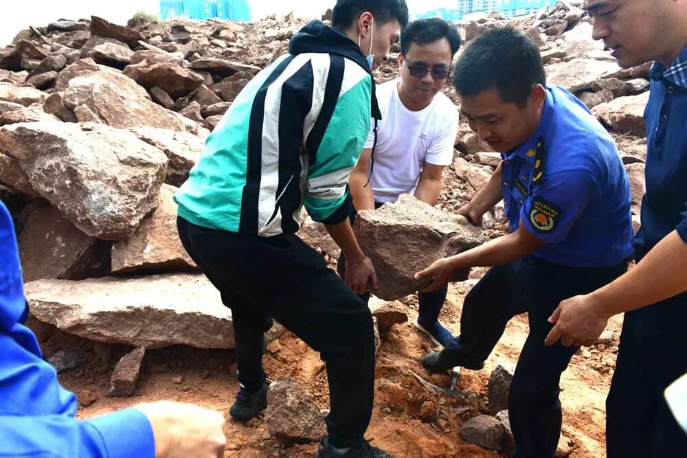 执法人员将嵌有恐龙蛋化石的红砂岩块集中捡拾起来。