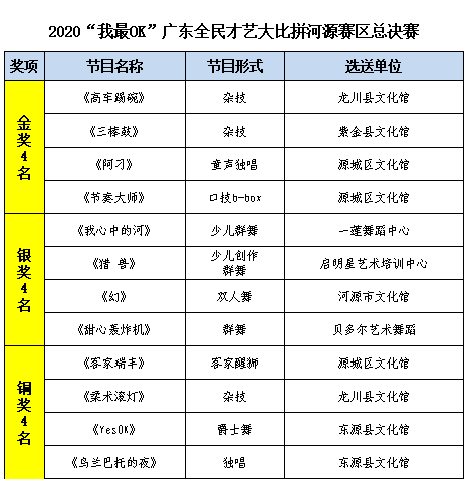 最终,比赛决出了金奖4名、银奖4名和铜奖4名。其中,龙川县文化馆选送的杂技《高车踢碗》、紫金县文化馆选送的杂技《三棒鼓》、源城区文化馆选送的童声独唱《阿刁》、源城区文化馆选送的口技b-box《节奏大师》获得金奖,并代表河源征战省赛。