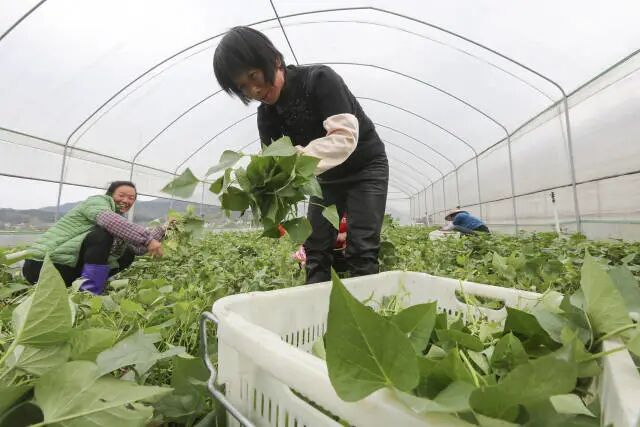 △2020年3月11日,在省定相对贫困村——船塘镇老围村的蔬菜基地大棚内,几位当地女工正在忙着采集薯苗蔓开始扩种红薯