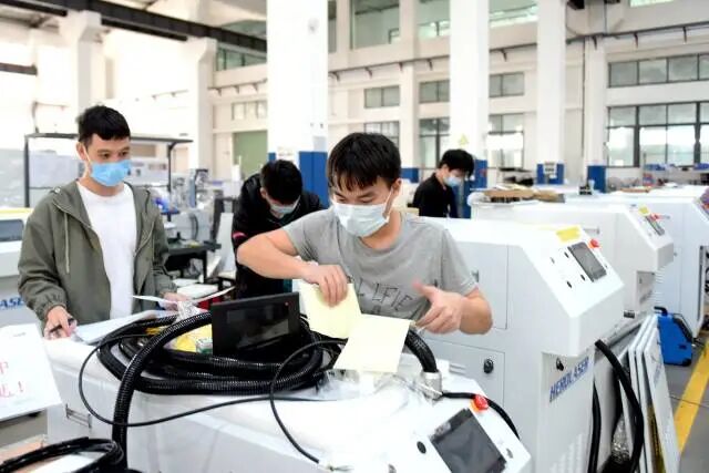 △2020年2月24日,在深圳盐田(东源)产业转移共建园智能制造集聚区内的国家级高新技术企业——铭镭激光智能装备(河源)有限公司生产车间,佩戴口罩工人正在有序作业